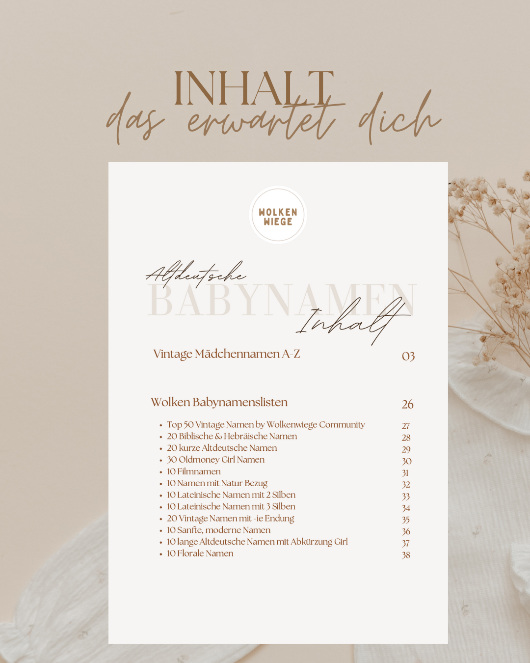 Das "Wolkenmädchen - Altdeutsche Namen" e-Book ist deine Namens-Quelle, um nach dem perfekten Mädchennamen zu suchen. Bestelle noch heute und lass Dich von der Welt der seltenen Namen verzaubern!